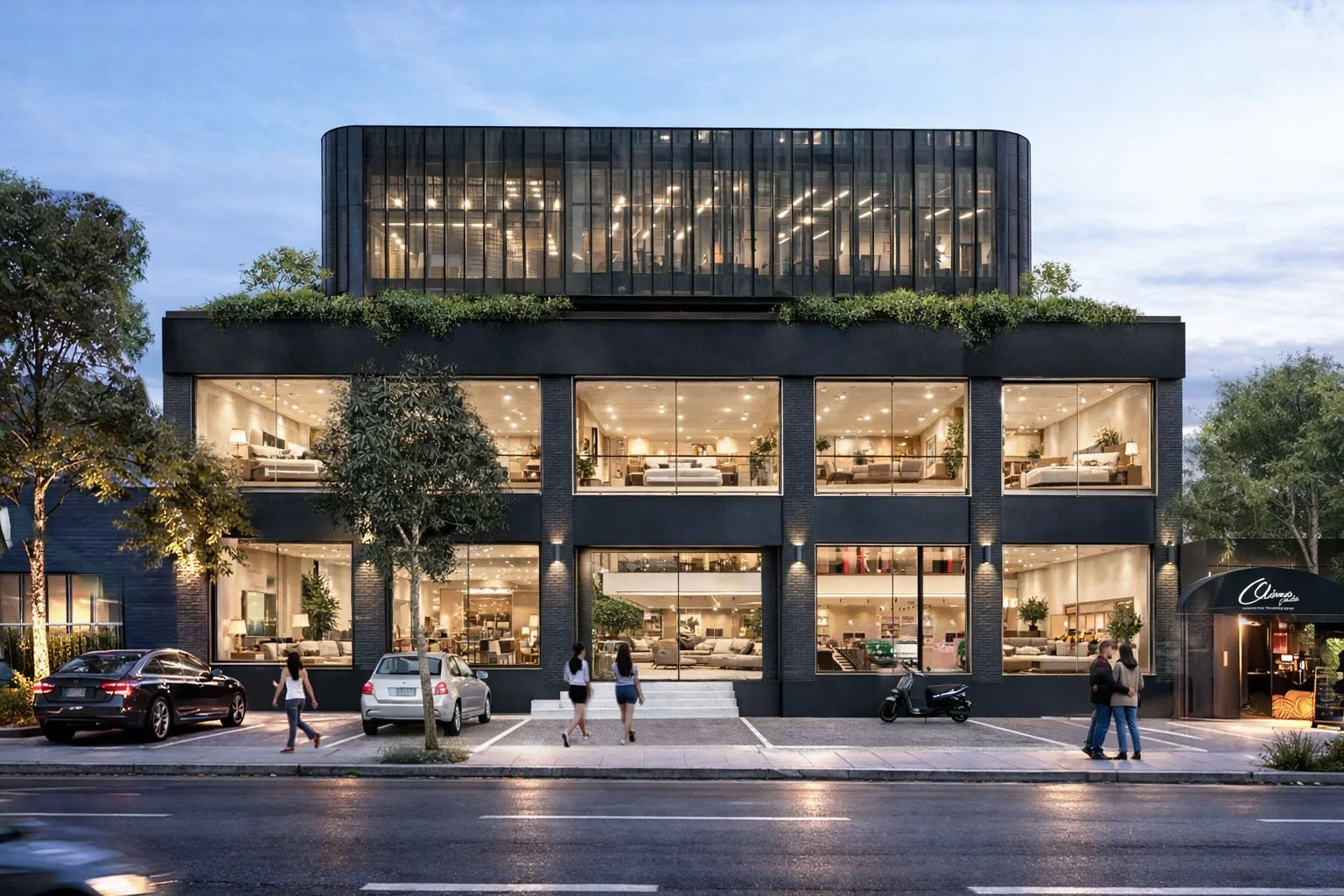 This concept involves adding a lightweight mesh addition above an existing brick commercial building, to create a high end showroom space. Metal mesh creates a glowing effect at night, and filtered daylight during the day.
