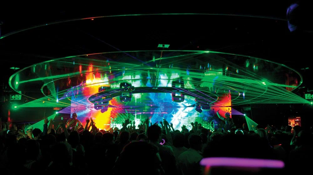 At the main club, radiating LED rings generate a series of pulsing sound waves across the ceiling, and are representative of the dynamic energy in this zone. Behind the DJ booth is an operable high definition LED screen - this opens up to reveal a performance stage behind, and brings the private bar into the flow of the main dance floor.